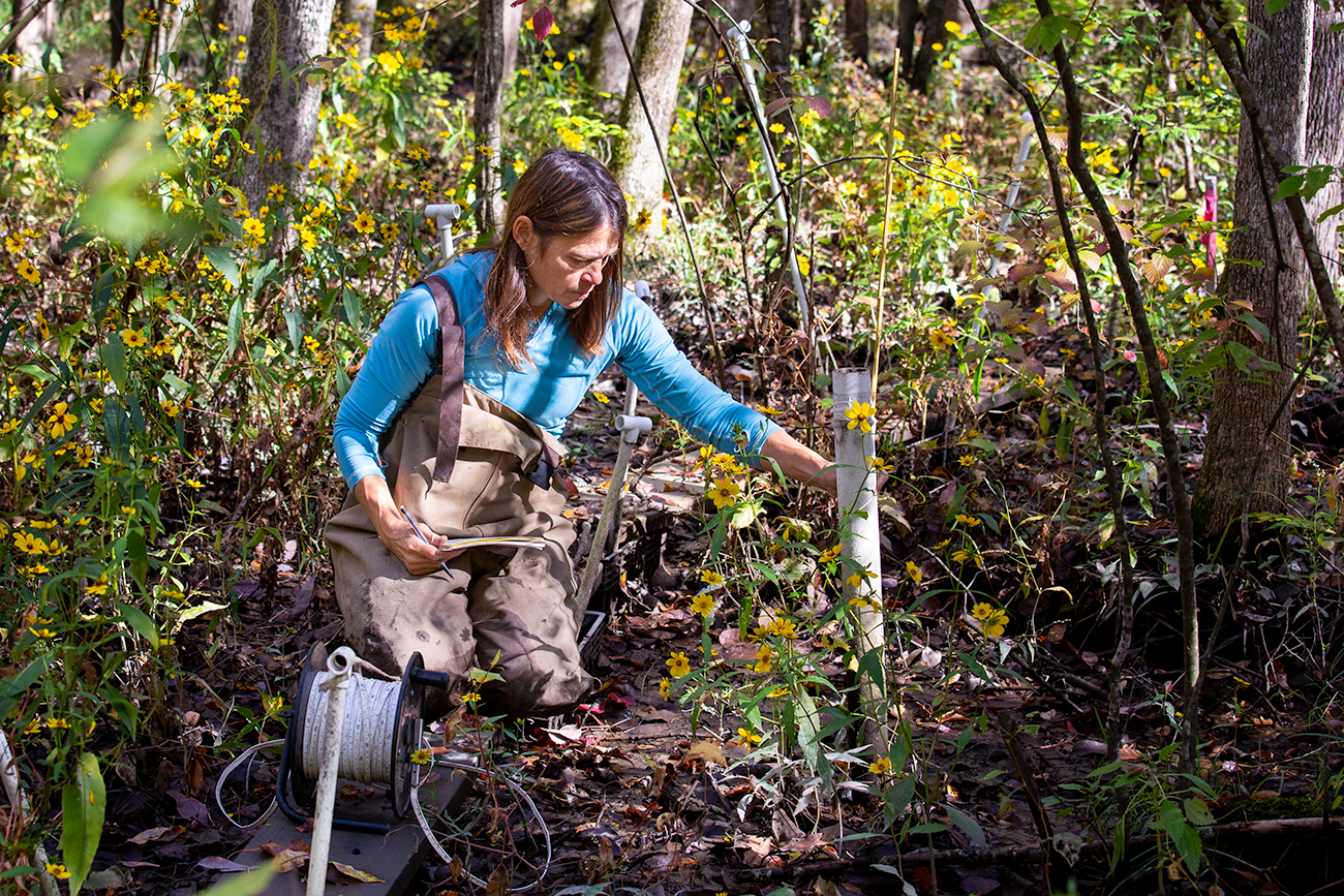Ecologist Diane Leason of the University of Maryland measures saplings, Nanticoke River wetland