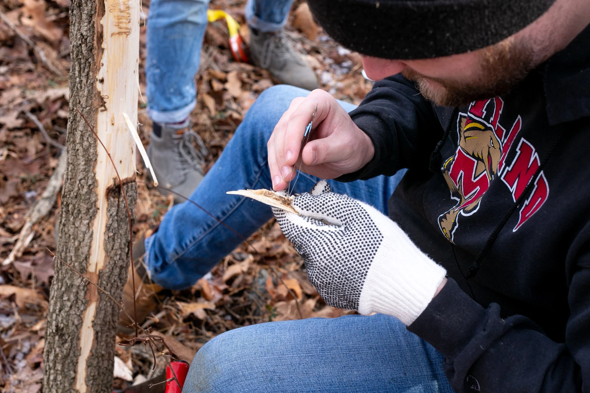 Entomologist Stokes Aker of the University of Maryland examines the effect of parasitoid wasps on emerald ash borer larvae, Patapsco Valley State Park