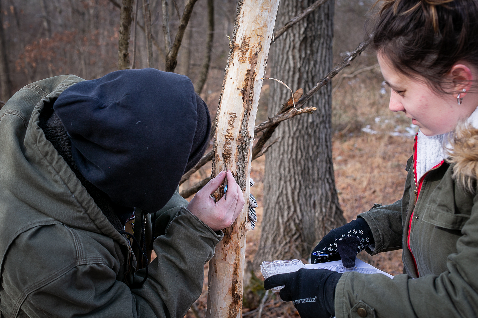 University of Maryland Gruner lab researchers examine the effects of parasitoid wasps on emerald ash borer larvae, Patapsco Valley State Park