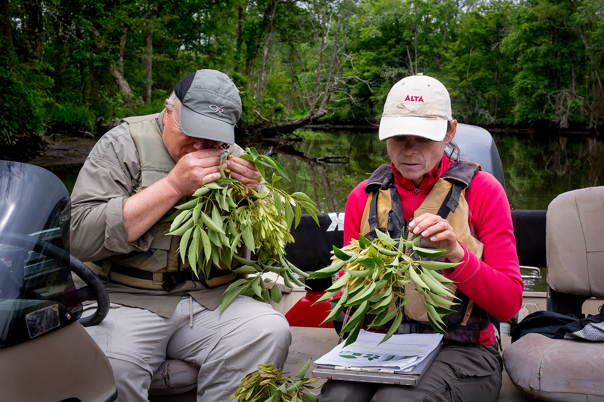 University of Maryland ecologists Andrew Baldwin and Diane Leason examine ash leaves, Marshyhope Creek