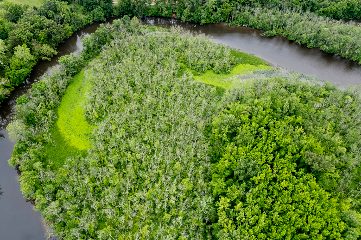 An infected ash grove stands in stark contrast to healthy trees, Tuckahoe Creek