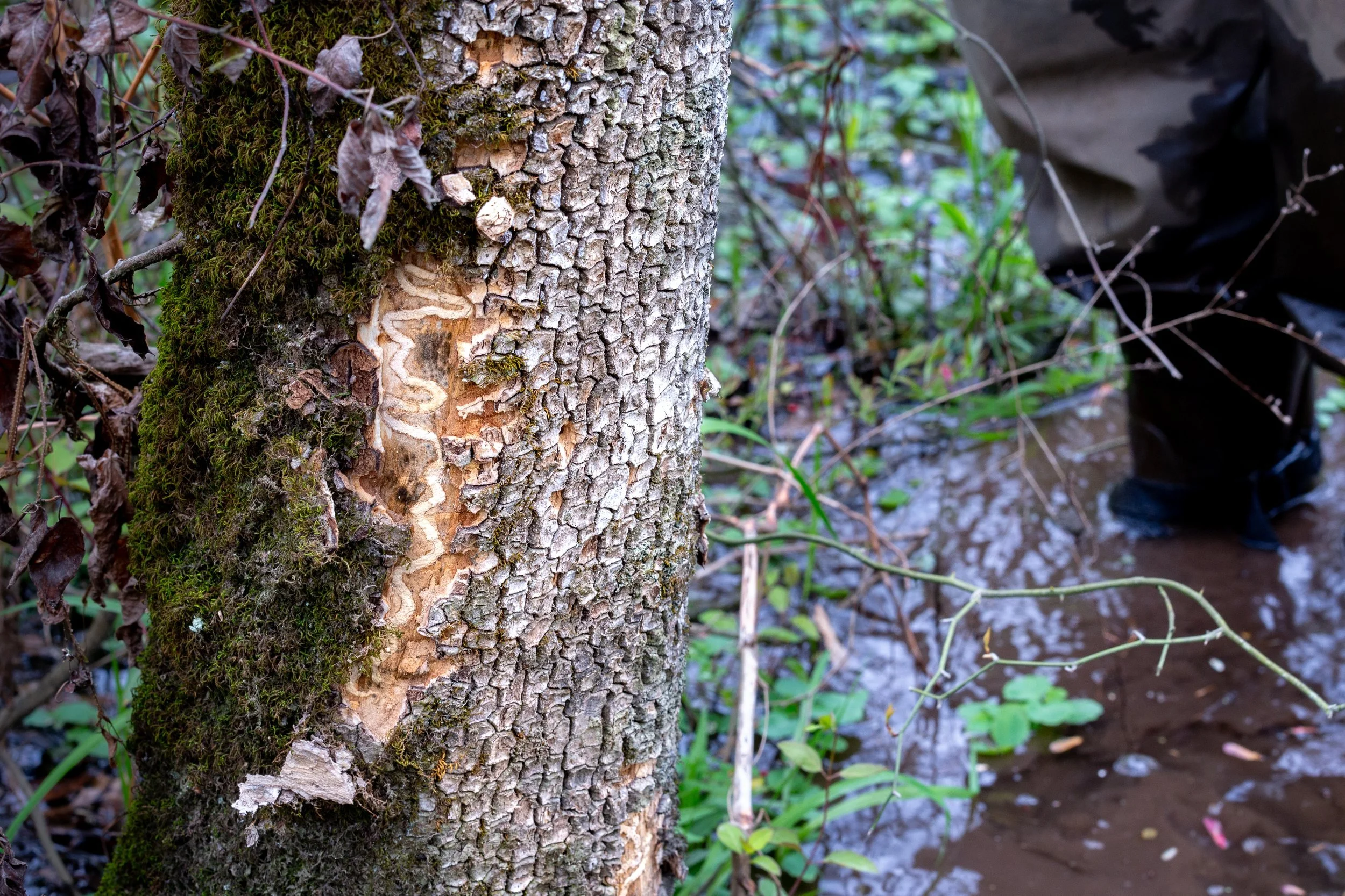 A "gallery,” the telltale sign of emerald ash borer presence, Tuckahoe Creek wetland