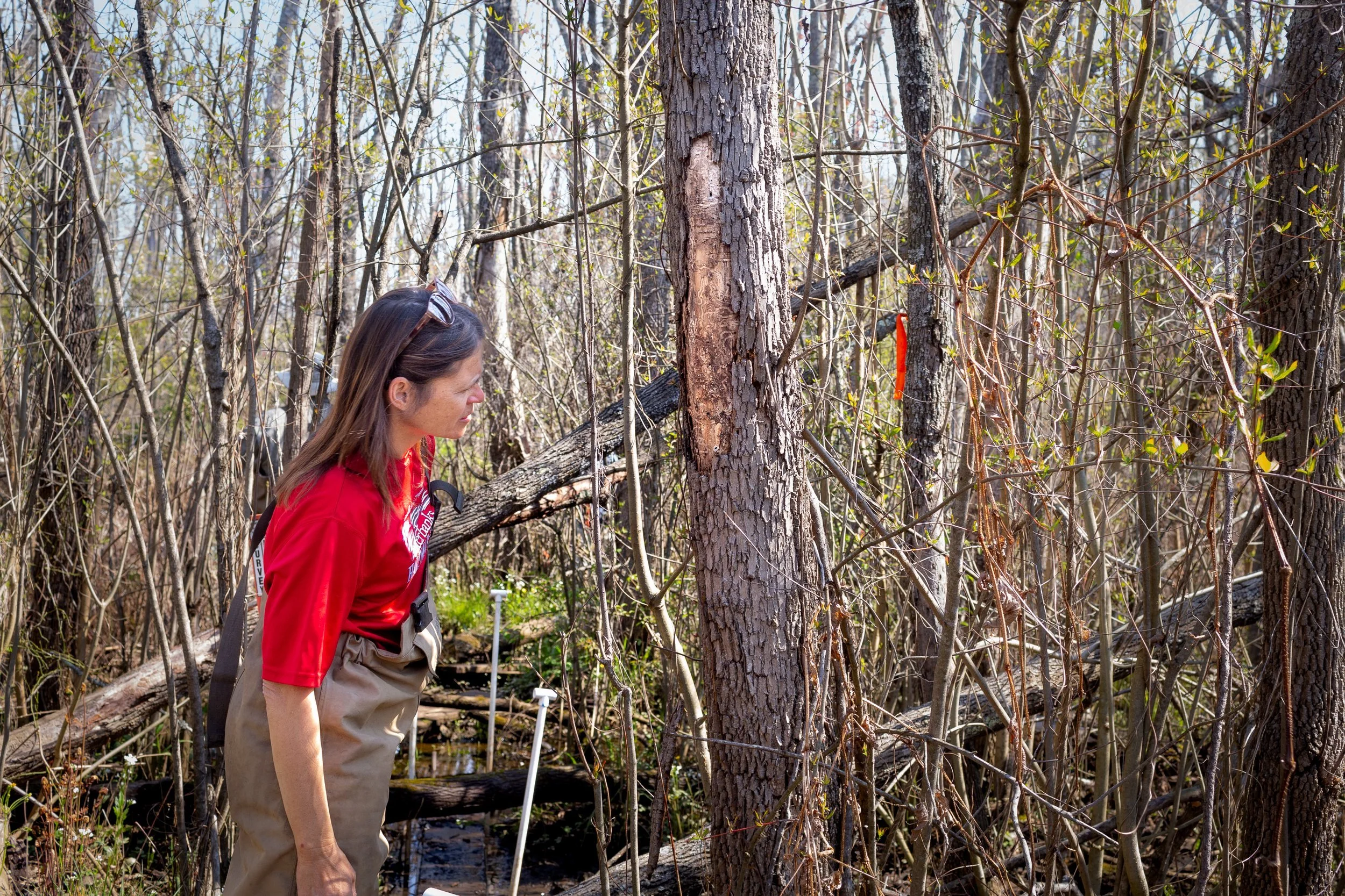 University of Maryland ecologist Diane Leason examines ash tree damage from the emerald ash borer, Patuxent Wetland Park